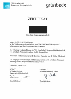 Zertifizierung „Trinkwasserhygiene“ nach VDI/DVGW 6023 Kategorie A