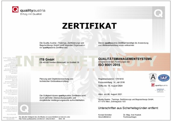 Durch unser internes Qualitätsmanagement, wiederkehrende Zertifizierungen und regelmäßige Fortbildungen sind alle unsere Projektmitarbeiter mit den Arbeits-und Planungsabläufen, die nach ISO 9001 zertifiziert sind, vertraut. Der internationale Standard ISO 9001 gibt Organisationen jeder Größe die Möglichkeit, Ihre Fähigkeiten qualitativ hochwertiger Produkte und Dienstleistungen nachzuweisen. Qualitätsmanagementsysteme dienen dazu, die Kundenzufriedenheit zu erhöhen und die internen Prozesse zu verbessern.