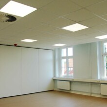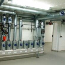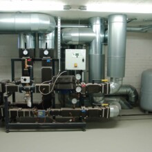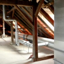 - Im Dachgeschoss der Gebäude Installation von Lüftungsgeräten (RLT-Geräte zum Belüften, Heizen, Kühlen mit effektiver Wärmerückgewinnung mittels Kreuzstromwärmetauscher) zur maschinellen Be- und Entlüftung der innenliegenden Räume und Seminarräume. Bedarfsgerechte Lüftung durch Schalter in den Seminarräumen