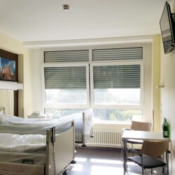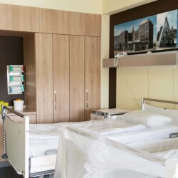 - Umbau einer Mitarbeitercafeteria zur Bettenstation NA5 mit 18 Zweibettzimmern, bei laufendem Betrieb der Geschosse darunter und darüber