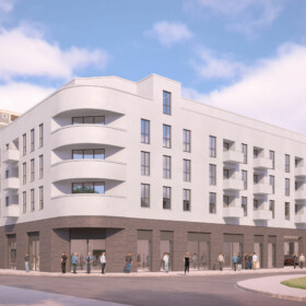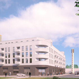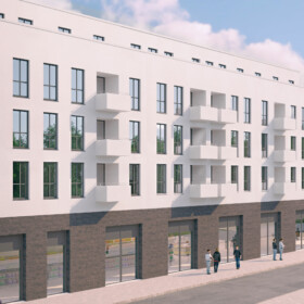 Neubau eines Wohn- und Geschäftshauses mit insgesamt 107 Wohneinheiten sowie Gewerbeflächen (Verkaufsflächen) und Parkflächen im Erdgeschoss. Das Gebäude ist unterkellert, hier befinden sich Keller- und Technikräume sowie die dazugehörige Tiefgarage und Fahrradstellplätze.